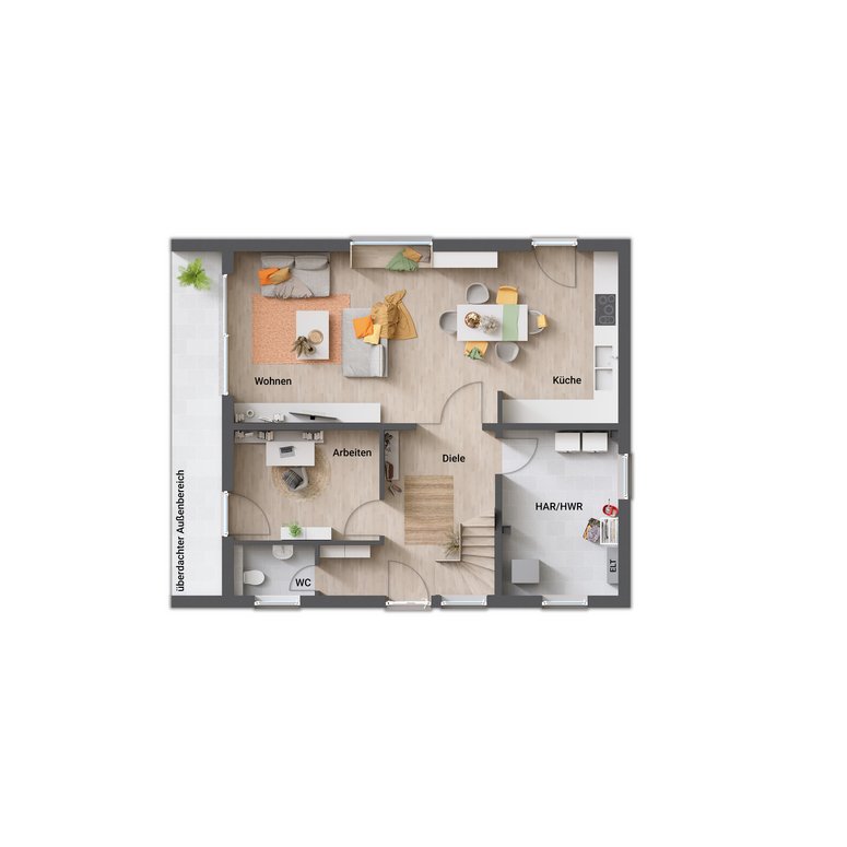 Das Highlight des Flair 134 Novo ist die überdachte Terrasse. Sie fügt sich harmonisch in die Gesamtarchitektur ein und schafft einen geschützten Außenbereich, der sowohl funktional als auch optisch überzeugt. Ob für gemütliche Stunden mit der Familie oder entspannte Abende im Freien – diese Terrasse wertet Ihr Wohnerlebnis spürbar auf.